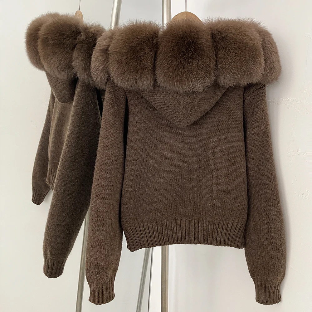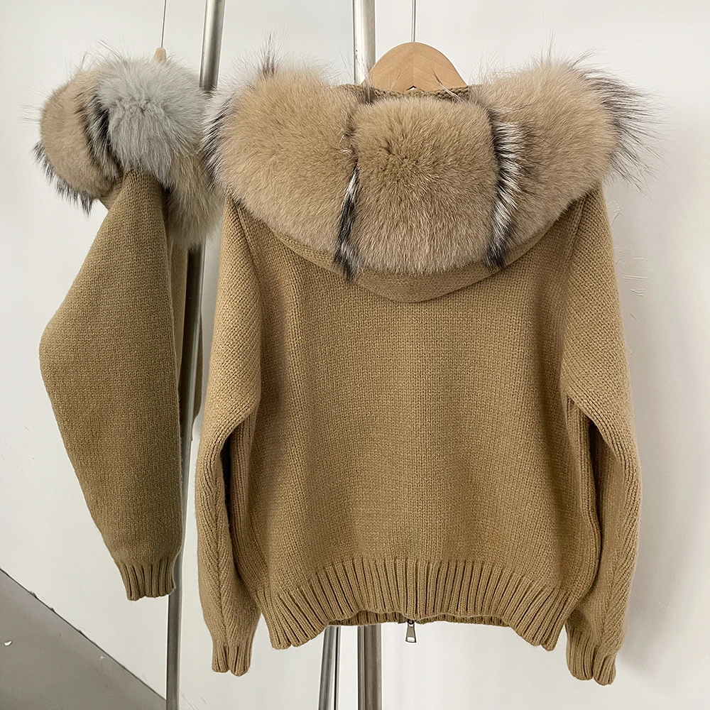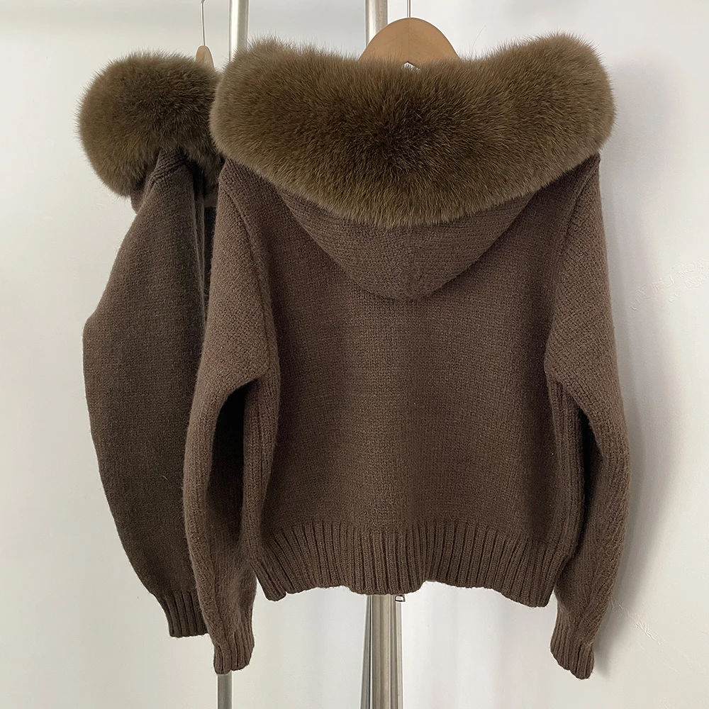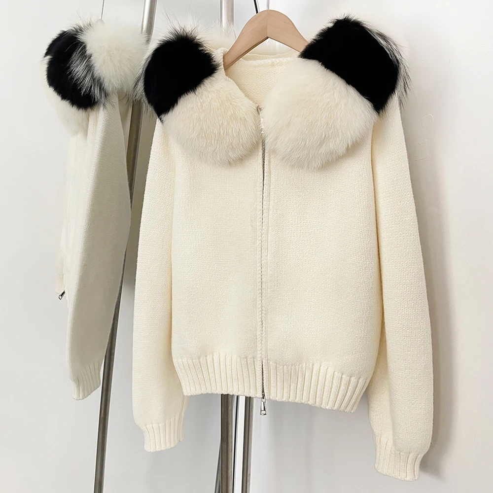 2024 Fashion Autumn Winter Casual Hooded Real Fox Fur Collar Fashion Short Knitted Jacket with Natural Fur Coat for Women