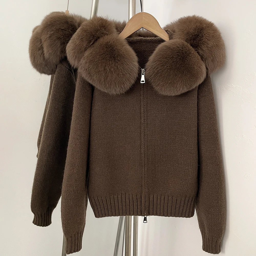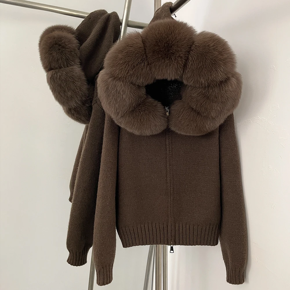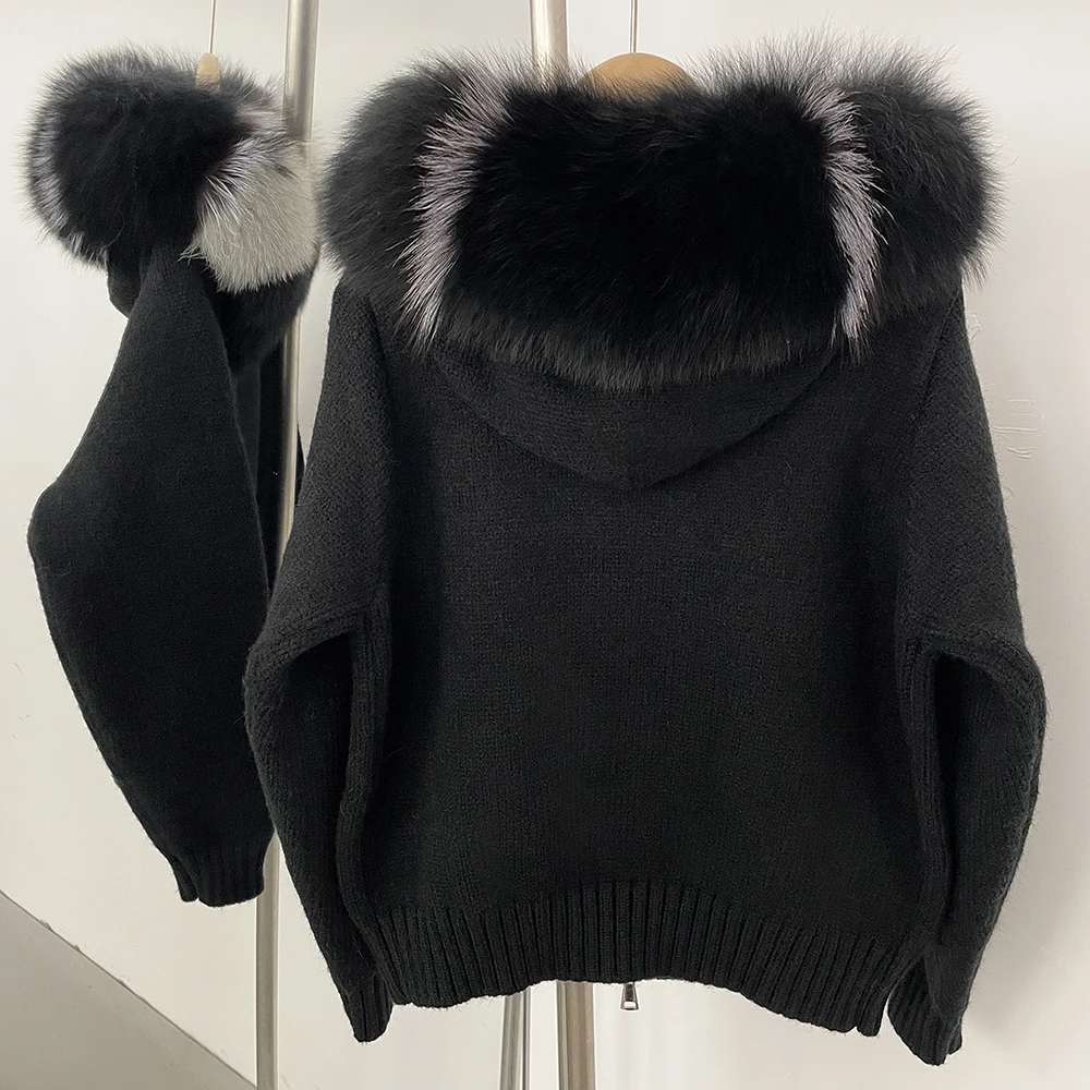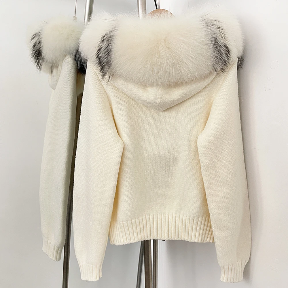 2024 Fashion Autumn Winter Casual Hooded Real Fox Fur Collar Fashion Short Knitted Jacket with Natural Fur Coat for Women